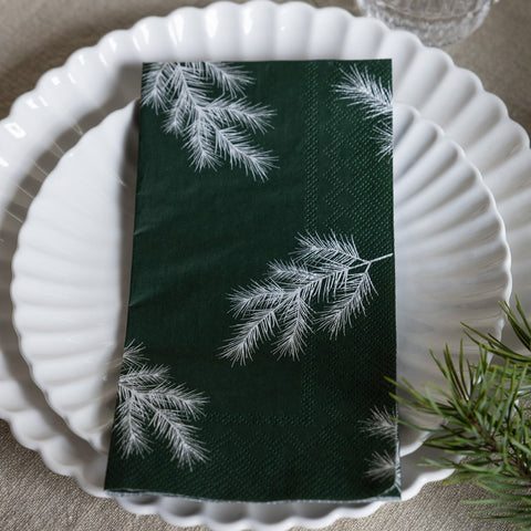 Rechteckige Papierservietten in zwei Variaten erhältlich. Mit grünen Tannenzweige auf weißem Grund oder weiße Zweige auf grünem Grund in schlichtem skandinavischen Design. Schafft das gewisse Etwas auf den verschiedenen weihnachtlichen Tischdekorationen. Stilvoll und klassisch, das in jedes Zuhause passt.